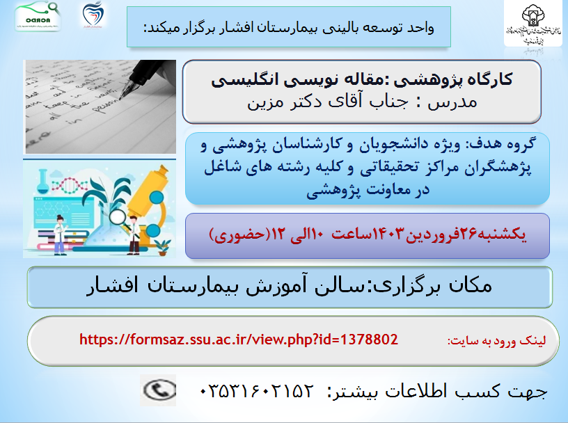 کارگاه مقاله نویسی انگلیسی به همت واحد توسعه تحقیقات بالینی بیمارستان افشار توسط جناب آقای دکتر مزین در تاریخ 26 فروردین 1403 در سالن آموزش بیمارستان افشار برگزار می شود.