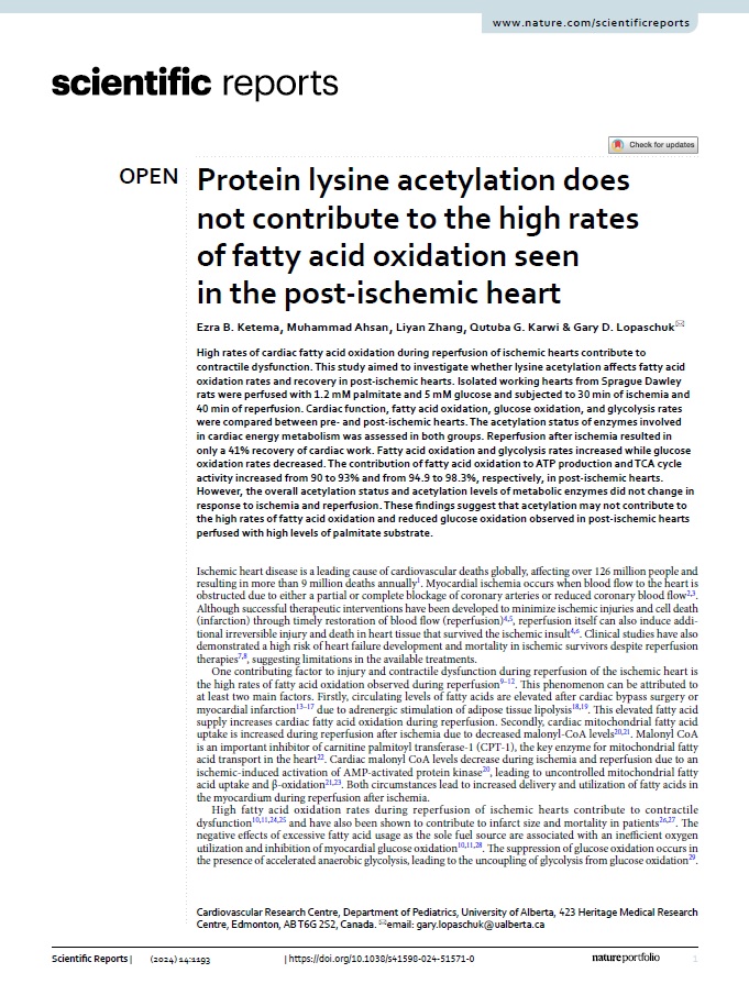 Protein lysine acetylation does not contribute to the high rates of fatty acid oxidation seen in the post-ischemic heart