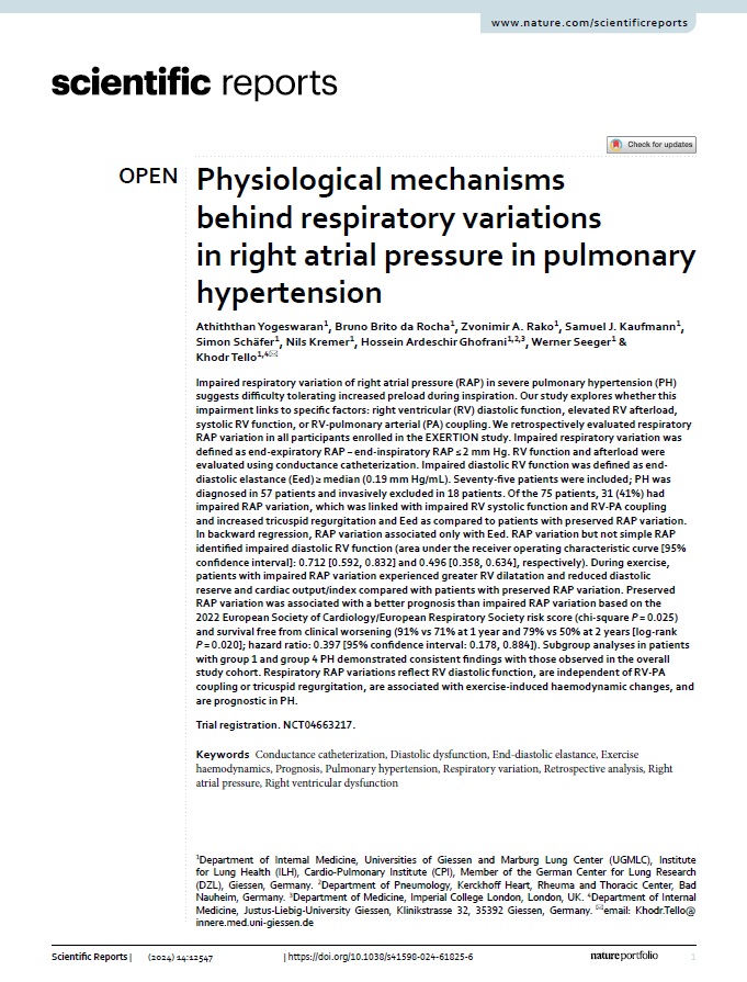 Impaired respiratory variation of right atrial pressure (RAP) in severe pulmonary hypertension (PH) suggests difficulty tolerating increased preload during inspiration. Our study explores whether this impairment links to specific factors: right ventricular (RV) diastolic function, elevated RV afterload, systolic RV function, or RV-pulmonary arterial (PA) coupling. We retrospectively evaluated respiratory RAP variation in all participants enrolled in the EXERTION study. Impaired respiratory variation was defined as end-expiratory RAP − end-inspiratory RAP ≤ 2 mm Hg. RV function and afterload were evaluated using conductance catheterization. Impaired diastolic RV function was defined as end-diastolic elastance (Eed) ≥ median (0.19 mm Hg/mL). Seventy-five patients were included; PH was diagnosed in 57 patients and invasively excluded in 18 patients. Of the 75 patients, 31 (41%) had impaired RAP variation, which was linked with impaired RV systolic function and RV-PA coupling and increased tricuspid regurgitation and Eed as compared to patients with preserved RAP variation. In backward regression, RAP variation associated only with Eed. RAP variation but not simple RAP identified impaired diastolic RV function (area under the receiver operating characteristic curve [95% confidence interval]: 0.712 [0.592, 0.832] and 0.496 [0.358, 0.634], respectively). During exercise, patients with impaired RAP variation experienced greater RV dilatation and reduced diastolic reserve and cardiac output/index compared with patients with preserved RAP variation. Preserved RAP variation was associated with a better prognosis than impaired RAP variation based on the 2022 European Society of Cardiology/European Respiratory Society risk score (chi-square P = 0.025) and survival free from clinical worsening (91% vs 71% at 1 year and 79% vs 50% at 2 years [log-rank P = 0.020]; hazard ratio: 0.397 [95% confidence interval: 0.178, 0.884]). Subgroup analyses in patients with group 1 and group 4 PH demonstrated consistent findings with those observed in the overall study cohort. Respiratory RAP variations reflect RV diastolic function, are independent of RV-PA coupling or tricuspid regurgitation, are associated with exercise-induced haemodynamic changes, and are prognostic in PH.