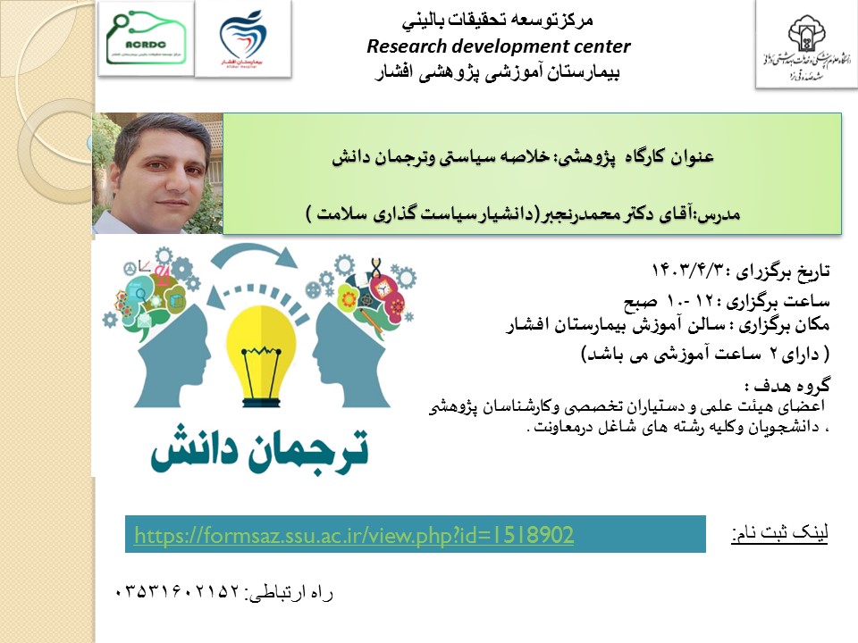 کارگاه خلاصه سیاستی و ترجمان دانش به همت واحد توسعه تحقیقات بالینی بیمارستان افشار توسط جناب آقای دکتر محمد رنجبر در تاریخ 3 تیر ۱۴۰۳ در سالن آموزش بیمارستان افشار برگزار می شود.