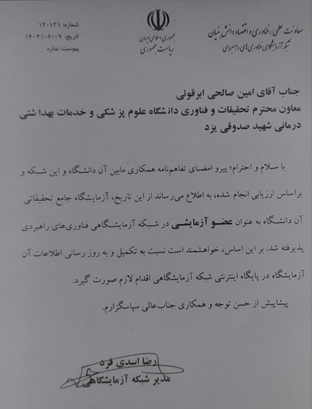 باتلاش و پیگیری های مستمر سرپرست ازمایشگاه جامع تحقیاتی و حمایت معاونت محترم تحقیقات و فناوری ،از تاریخ 1403/06/07 این مرکز به عضویت شبکه آزمایشگاهی فناوری های راهبردی درآمد.