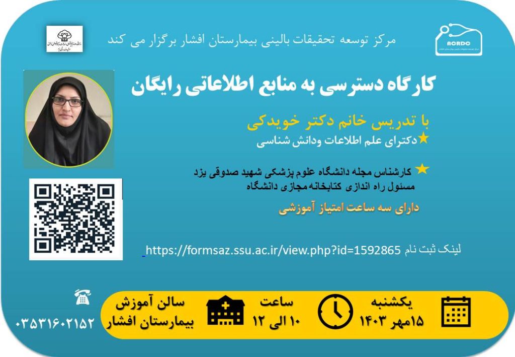 کارگاه دسترسی به منابع اطلاعاتی رایگان به همت واحد توسعه تحقیقات بالینی بیمارستان افشار توسط خانم دکتر خویدکی در تاریخ 15 مهر ۱۴۰۳ در سالن آموزش بیمارستان افشار برگزار می شود.