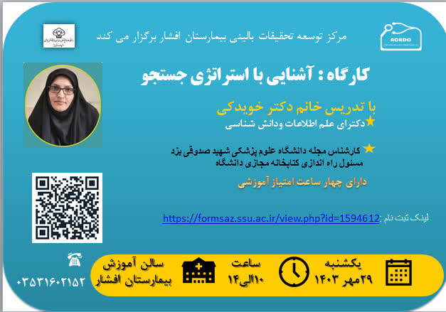 کارگاه آشنایی با استراتژی جستجو به همت واحد توسعه تحقیقات بالینی بیمارستان افشار توسط دکتر خویدکی در تاریخ 29 مهر ۱۴۰۳ در سالن آموزش بیمارستان افشار برگزار می شود.