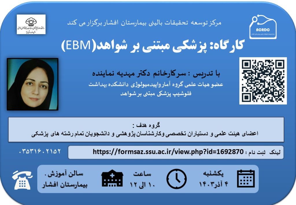 کارگاه پزشکی مبتنی بر شواهد به همت واحد توسعه تحقیقات بالینی بیمارستان افشار توسط دکتر نماینده در تاریخ 4 آذر ۱۴۰۳ در سالن اجتماعات بیمارستان افشار برگزار می شود.