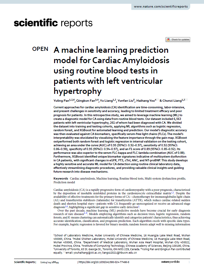 Current approaches for cardiac amyloidosis (CA) identification are time-consuming, labor-intensive, and present challenges in sensitivity and accuracy, leading to limited treatment efficacy and poor prognosis for patients. In this retrospective study, we aimed to leverage machine learning (ML) to create a diagnostic model for CA using data from routine blood tests. Our dataset included 6,563 patients with left ventricular hypertrophy, 261 of whom had been diagnosed with CA. We divided the dataset into training and testing cohorts, applying ML algorithms such as logistic regression, random forest, and XGBoost for automated learning and prediction. Our model’s diagnostic accuracy was then evaluated against CA biomarkers, specifically serum-free light chains (FLCs). The model’s interpretability was elucidated by visualizing the feature importance through the gain map. XGBoost outperformed both random forest and logistic regression in internal validation on the testing cohort, achieving an area under the curve (AUC) of 0.95 (95%CI: 0.92–0.97), sensitivity of 0.92 (95%CI: 0.86–0.98), specificity of 0.95 (95%CI: 0.94–0.97), and an F1 score of 0.89 (95%CI: 0.85–0.92). Its performance was also superior to the serum FLC-kappa and FLC-lambda combination (AUC of 0.88). Furthermore, XGBoost identified unique biomarker signatures indicative of multisystem dysfunction in CA patients, with significant changes in eGFR, FT3, cTnI, ANC, and NT-proBNP. This study develops a highly sensitive and accurate ML model for CA detection using routine clinical laboratory data, effectively streamlining diagnostic procedures, and providing valuable clinical insights and guiding future research into disease mechanisms.