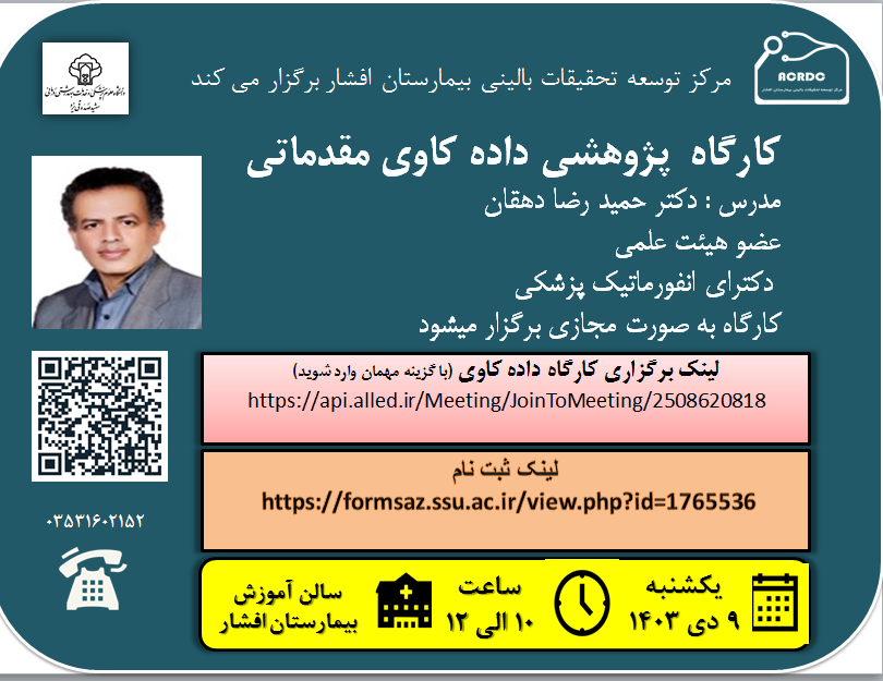 کارگاه داده کاوی مقدماتی باحضور مدرس محترم دکتر حمیدرضا دهقان در تاریخ 1403/10/9 بصورت مجازی برگزاری میگردد.