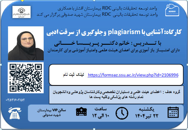 کارگاه آشنایی با plagiarism و جلوگیری از سرقت ادبی توسط مدرس دکتر پریسا خانی در تاریخ 22 تیر ۱۴۰۴ ساعت ۱۰ صبح در سالن VIP بیمارستان شهید صدوقی برگزار میگردد.
