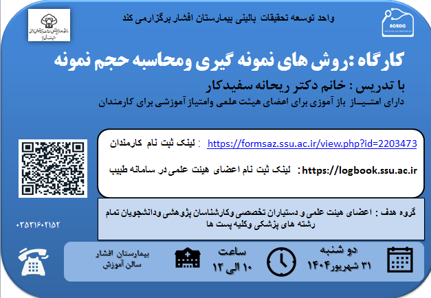 کارگاه روش های نمونه گیری ومحاسبه حجم نمونه در تاریخ 1404/6/31 ساعت 10 صبح در سالن آموزش بیمارستان افشار توسط مدرس سرکار خانم دکتر ریحانه سفید کار برگزار می شود.