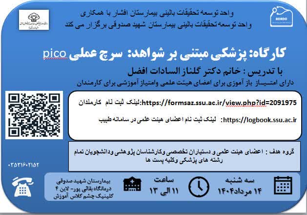 مرکز توسعه تحقیقات بالینی بیمارستان افشار با همکاری واحد توسعه تحقیقات بالینی بیمارستان شهید صدوقی برگزار می کند: