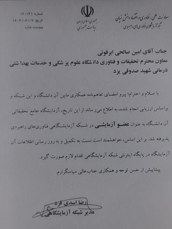 عضویت آزمایشگاه جامع تحقیقاتی در شبکه آزمایشگاهی فناوری های راهبردیرابط آزمایشگاه جامعشهریور 17, 1403باتلاش و پیگیری های مستمر سرپرست ازمایشگاه جامع تحقیاتی و حمایت معاونت محترم ... اطلاعات بیشتر