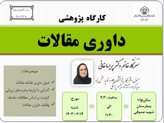 کارگاه پژوهشی داوری مقالاترابط مرکز توسعه تحقیقات بالینی Rdc شهید صدوقیمهر 1, 1403مرکز توسعه تحقیقات بالینی بیمارستان شهید صدوقی برگزار می کند کارگاه پژوهشی داوری ... اطلاعات بیشتر