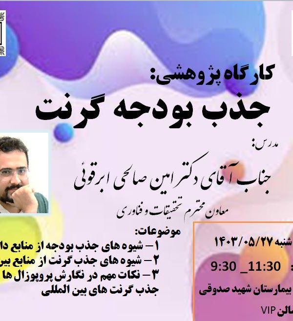 کارگاه پژوهشی جذب بودجهرابط مرکز توسعه تحقیقات بالینی Rdc شهید صدوقیمرداد 20, 1403مرکز توسعه تحقیقات بالینی بیمارستان شهید صدوقی برگزار می کند کارگاه پژوهشی جذب ... اطلاعات بیشتر
