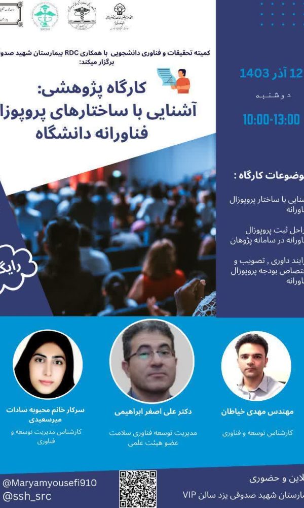 کارگاه آشنایی با ساختارهای پروپوزال فناوری دانشگاهرابط مرکز توسعه تحقیقات بالینی Rdc شهید صدوقیآذر 9, 1403کمیته تحقیقات و فناوری دانشجوی با همکاری مرکز توسعه تحقیقات بالینی بیمارستان شهید ... اطلاعات بیشتر